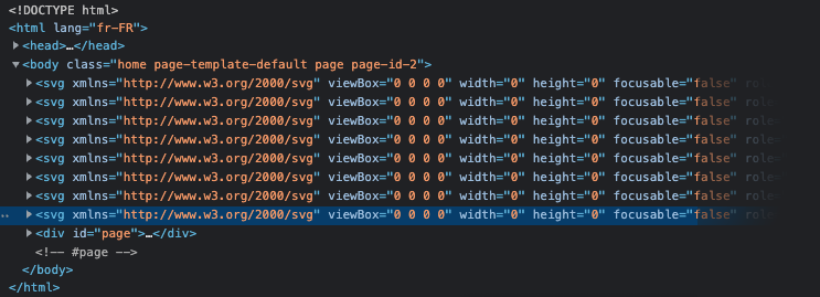 Sur cette capture, nous pouvons constater que 8 images SVG sont insérées. Il s’agit des 8 filtres duotone que l’on retrouve dans le back-office de WordPress lors de l’édition d’une image. Ce sont les filtres duotone par défaut de WordPress :