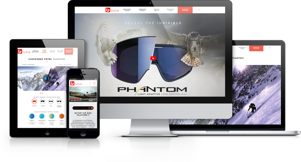 Le développement de ce thème spécifique WordPress s’est axé sur la rubrique « Choisir votre Phantom » qui est une aide au choix des différentes lunettes que propose la gamme. L’utilisateur choisi son activité (Montagne, Cyclisme, Golf ou Outdoor/Lidestyle), la météo (Beau temps, nuageux ou mauvais temps) et la couleur des verres de ses lunettes (ou masque le cas échéant). Des visuels se chargent à la volée et l’utilisateur peut voir l’effet de tel verre dans telle situation. Démonstration en vidéo :