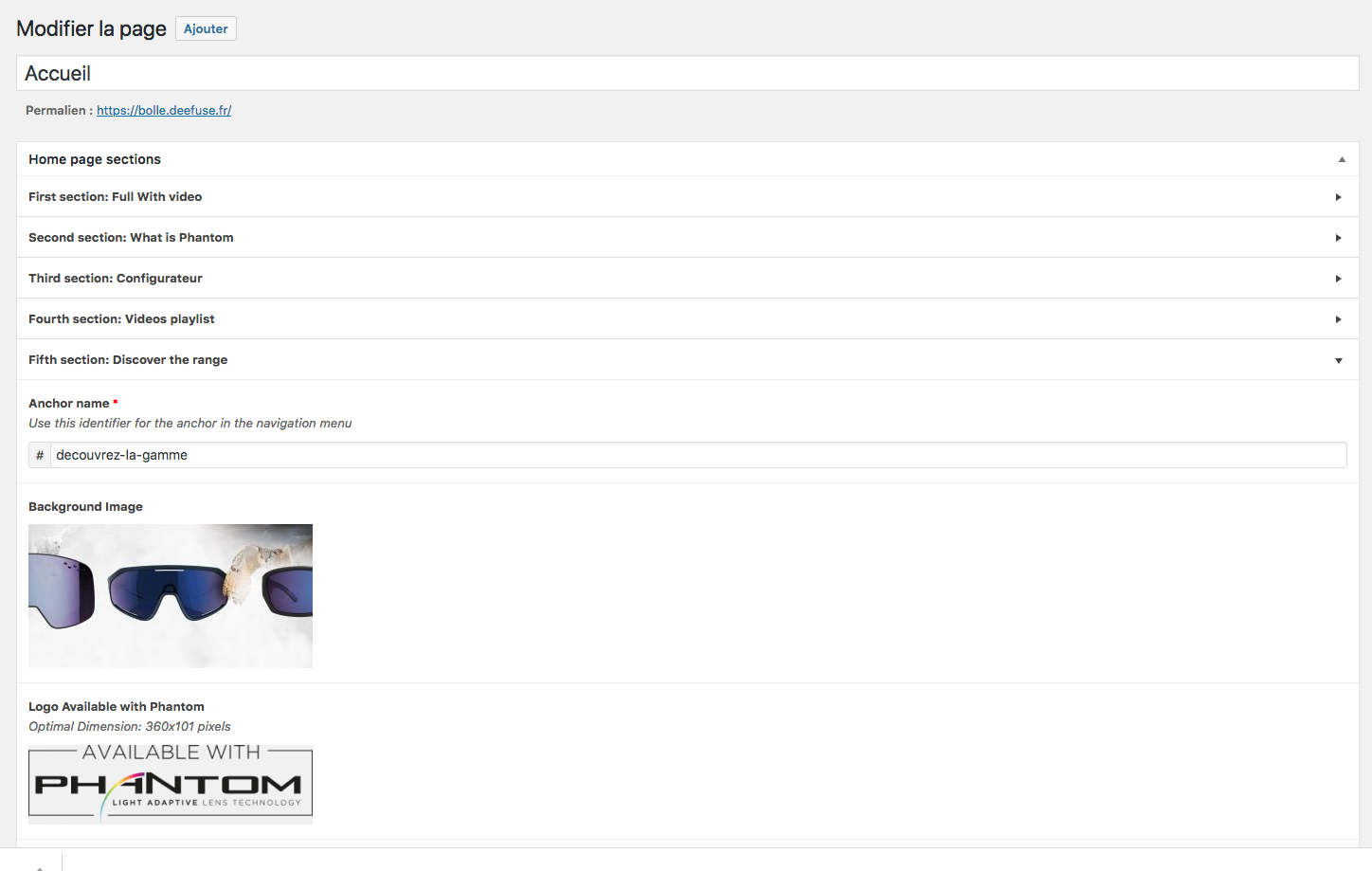 ACF est un précieux allié pour le développement de thème sous WordPress : Chaque section du site one-page est géré dans l’interface d’administration de WordPress par un onglet ACF.